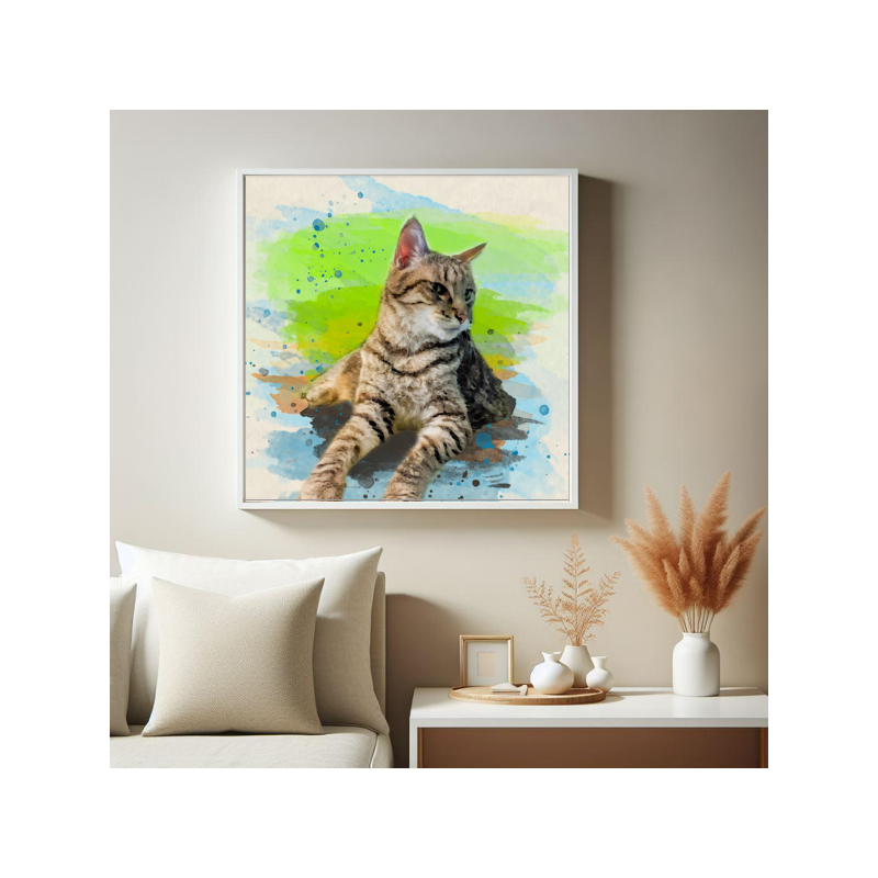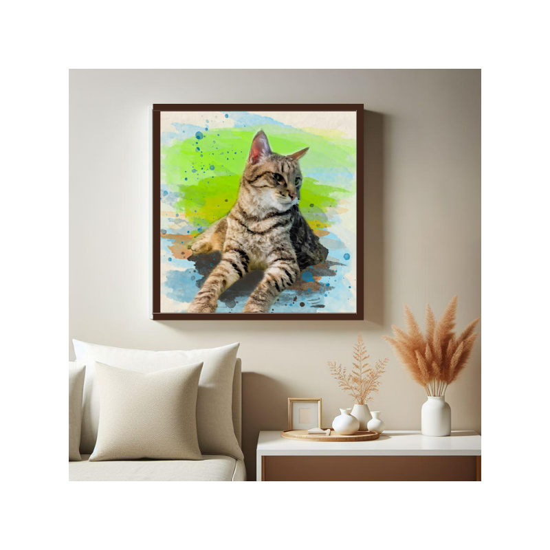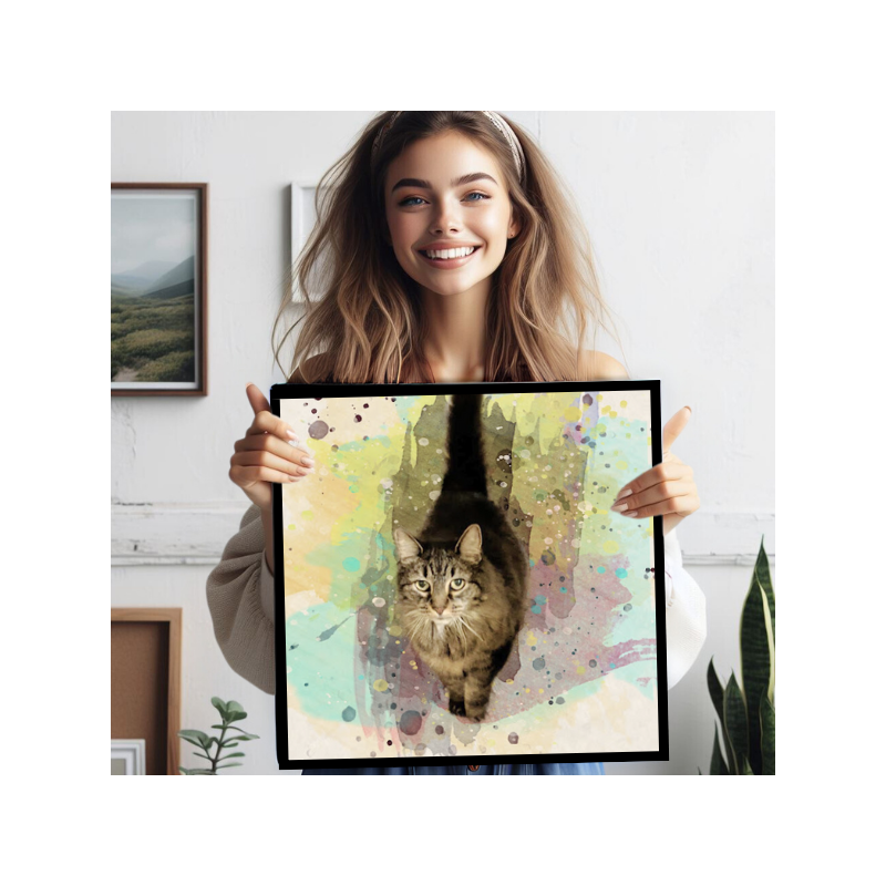 Your cat's photo will be transformed into a Color Splash style painting with the help of outstanding Snappy Canvas portrait painters. The brilliant splashes of colors capture the essence of your cat portrait. The captivating look of this technique will amaze both you and your cat!