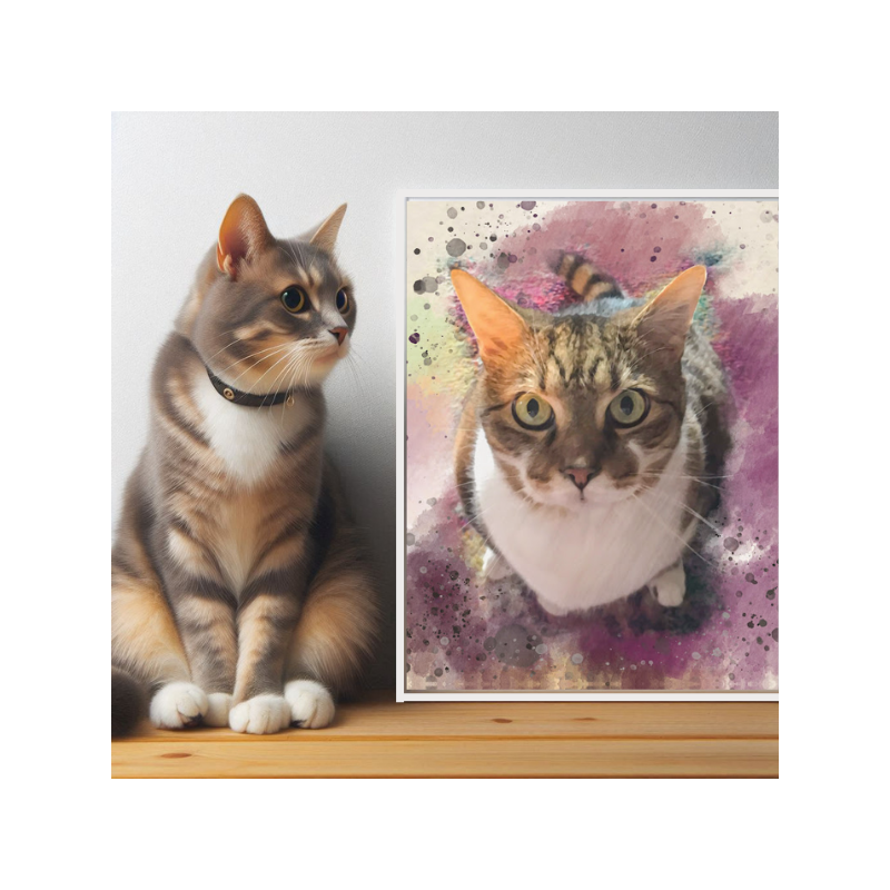 This colorful art splash technique is a fun way to portray your furry friend. Your cat's photo will be made into a frisky and lively cat portrait painting by 100% real artists. Each cat colorsplash artwork is as unique as your own kitty!