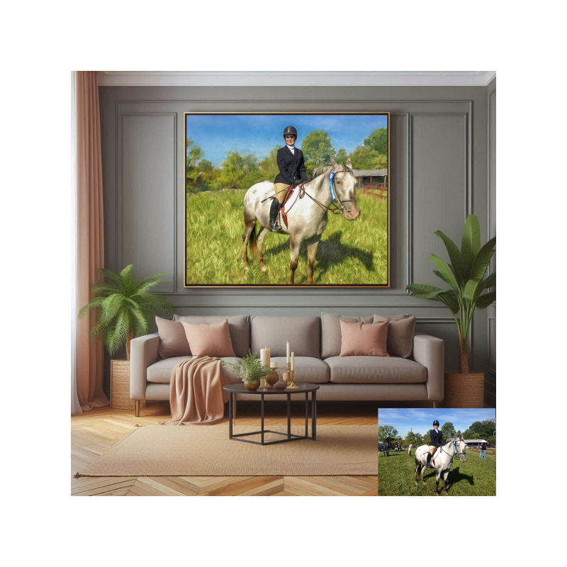 Painted Oil Canvas art from picture of a lady riding her horse prominently displayed in living room